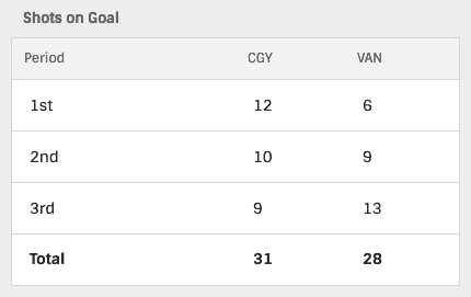 Calgary carried their 1-0 lead into the next period, as well as a 12-6 lead in total shots.