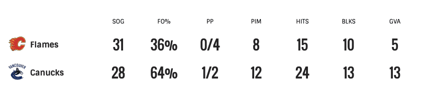 The Canucks actually didn’t do too badly in this one, stats wise. They dominated in faceoffs, scored a power play goal, killed 4 penalties, and dramatically outhit the Flames. They played with a serious amount of effort and jump all night long.