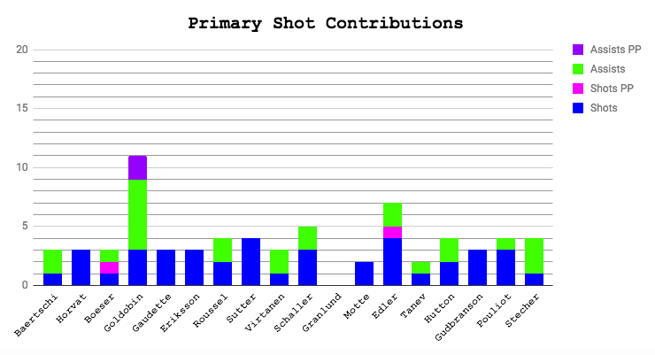 - Nikolay Goldobin continues distributing the puck at an elite level, how many plays does this guy need to create to earn your respect? He’s currently generating 20.01 primary shot assists/60, which tops Henrik Sedin’s team leading rate from last year of 15.92/60 by a mile. As the sample grows, his level of play is becoming more impressive, and he hasn’t slowed down without Elias Pettersson.