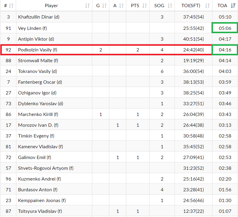 Those minutes were still low when it came to SKA forwards, as he was 10th in ice time out of the forwards and still found a way to be the most impactful player in the game. Here’s a look at the leaders in time on attack, a stat that measures the time you spend in the offensive zone with your team having possession of the puck. Podkolzin was the second-highest out of the forwards, only trailing Linden Vey. As I mentioned earlier, he was 10th out of SKA forwards for overall ice time, he just spent a bunch of that time in the offensive zone.