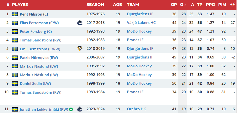 With 19 goals on the year, he now holds sole possession of fourth place in the SHL and is now just two goals behind Canucks legend, Daniel Sedin for the most goals by a U20 skater. With five games remaining, he trails Elias Pettersson’s total of 24 from the 2017-18 season by five goals.