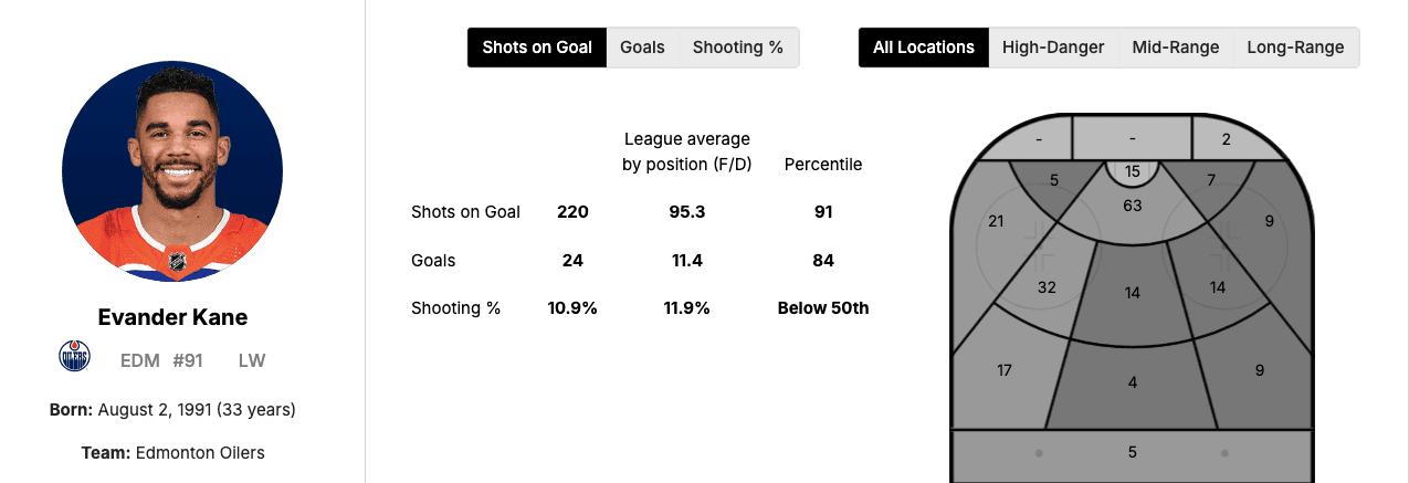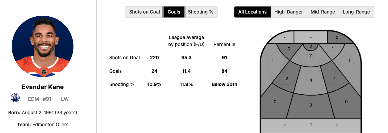 That is the area where Kane finds most of his success. Looking back at his 2023-2024 regular season NHL Edge data, you can see Kane got most of his goals from the high-danger area in front of the net. Of his 220 shots that season, 78 came from that area, which works out to be 35.5% of his shots on goal.