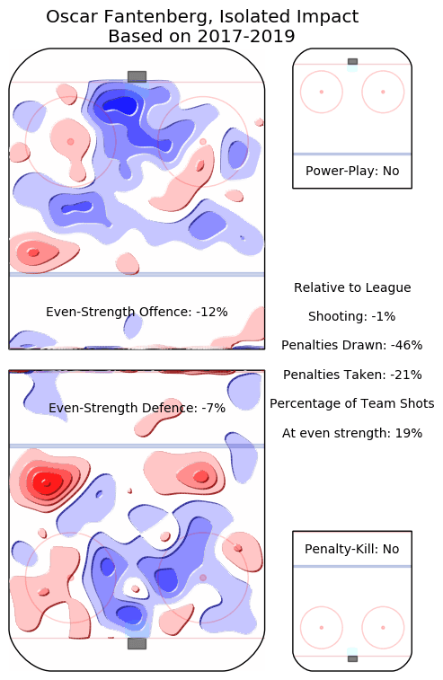 Micah Blake McCurdy’s isolated impact metric simply demonstrates Fantenberg’s ability while taking away the impact his teammates had on his results. Contrasting his immense lack of any offence, the defenceman has historically limited his competition to a below-average amount of scoring chances in high-danger areas.