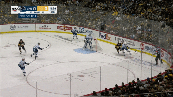 But it wasn’t just the zone exits where Pittsburgh exercised its skill. They also made an effort to pressure whichever Canuck was preparing the breakout. This type of penalty kill makes it much harder for teams on the man advantage to set up, and often leads to panicked passes or low danger shots under pressure.