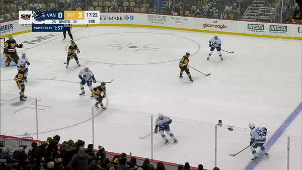 The Canucks only got one decent chance at setting up during their sole power play opportunity yesterday, and the Pens’ penalty kill quickly assumed control of the puck. But rather than immediately slap the puck back into the Canucks’ end, Evan Rodrigues bleeds a few precious seconds off the clock before lightly flipping the puck into the corner.