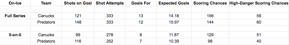 So, while it was a back-and-forth series, the penalty discrepancies really inflated the Predators’ numbers. Nashville had 22 powerplay opportunities to Vancouver’s 13. If we look into each team’s 5-on-5 numbers for the series, it paints a different picture.