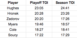 Hronek, however, was a ghost during the opening round, and there may be a different reason he’s playing less. But hey, it’s nice to have your bottom pairing guys step up offensively (Zadorov) and defensively (Cole) and play extra minutes when your top guys are hurting and struggling.