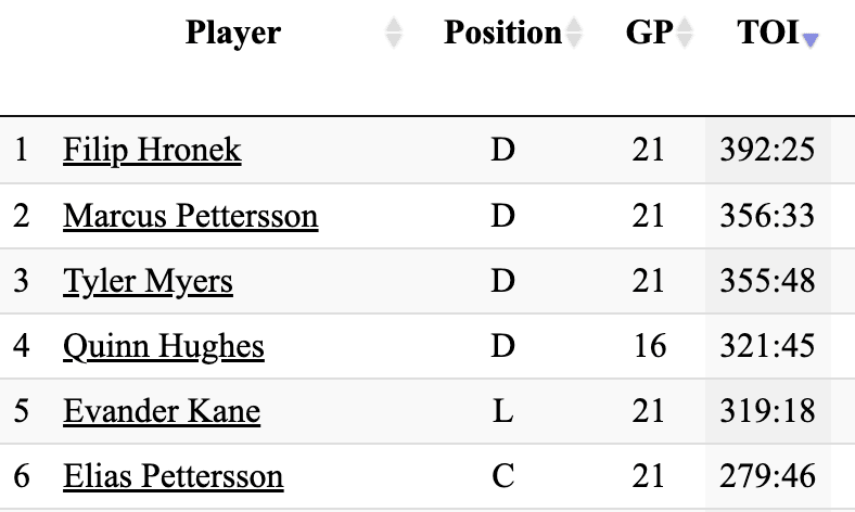 With or without Quinn Hughes on his pairing, Filip Hronek has been a major bright spot for the Canucks. On top of filling in admirably when called upon to quarterback the first power play unit, Hronek has put up a more than respectable 12 points in 21 games. Only Quinn Hughes has a higher average ice time than Hronek, and because the veteran defenceman has appeared in all 21 of the club’s games, he leads the Canucks in total ice time by a significant margin: