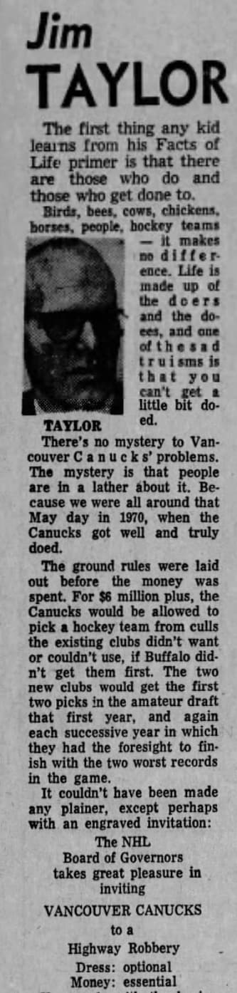 While their Canucks’ season was obviously disappointing, it surprised few. The team had been given very unfavourable conditions in the 1970 expansion draft, and weren’t expected to compete. This is detailed succinctly, and colourfully, by sportswriter Jim Taylor in a 1972 article for the Vancouver Sun: