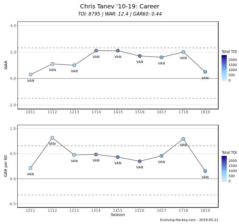But that is about the only thing that has been a positive as of late for Tanev. He has kept his defensive reliability, but with a massive sacrifice to providing reasonable offensive production for his team. His goals above replacement per hour has never been lower in his career than last season — his overall contribution to the Canucks while on the ice has not been worse.