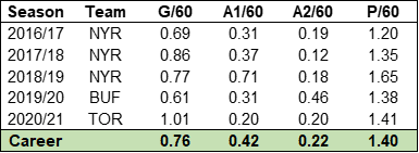 Throughout his NHL career, Vesey has done most of his scoring at 5-on-5 rather than relying on the power play to boost his point totals. He has posted 117 points (94 of which came at 5-on-5) in 334 career NHL games, which is good for about a 29 point pace over a regular 82-game season. That’s a credible third-line pace and probably makes him one of the better wingers on the Canucks right now. In terms of scoring efficiency, we can break down his per60 scoring rates by season with the table below: