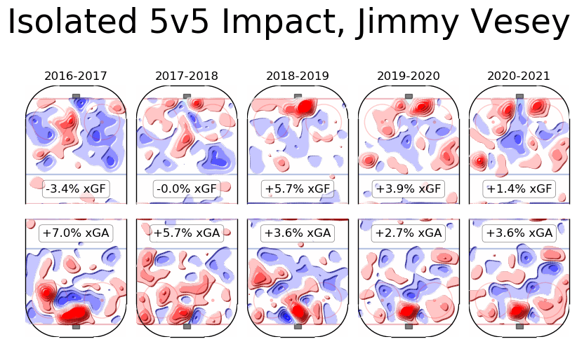 As far as play driving is concerned, Vesey has yet to prove that he’s a play-driving winger at the NHL level. Historically, his teammates have generated slightly more offence while he’s on the ice compared to league average, but are also marginally worse off in the defensive end.