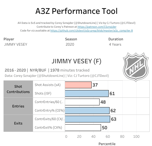 Vesey’s ability to transition the puck out of his own zone and into the offensive zone is about average too, as shown below: