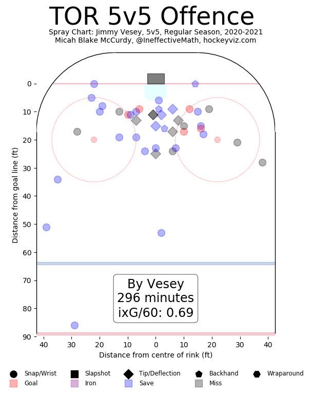 Despite all the attention towards his offensive upside, however, Vesey has actually quietly carved himself a penalty-killing role the past few seasons. He played about a minute of shorthanded TOI per game in both Buffalo and Toronto and was an effective penalty killer in terms of suppressing quality chances against.
