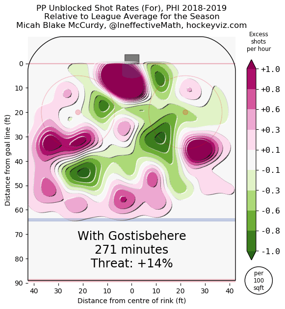 Provided by hockeyviz.com, this heatmap for the Flyer’s production while the 26-year-old defenceman is on the ice demonstrates his constant ability to award his team with scoring chances. Getting an insane amount of shot attempts in that key area in front of the net, Gostisbehere is an elite power play quarterback — one of the hardest positions to truly fill on a blue line.