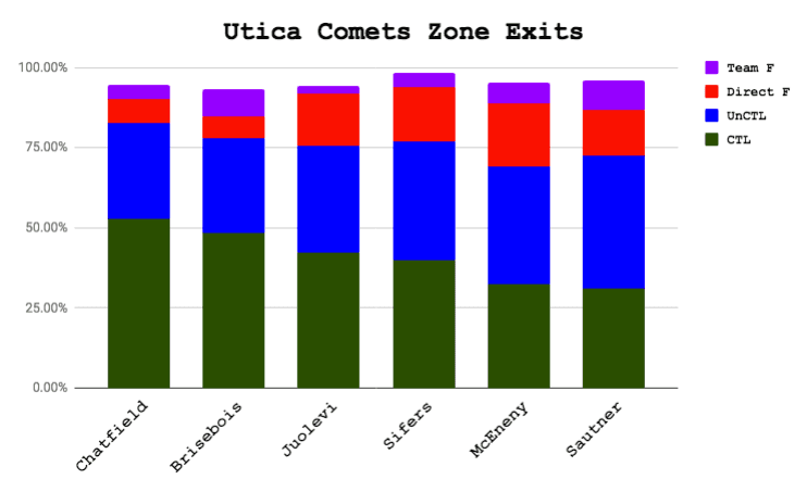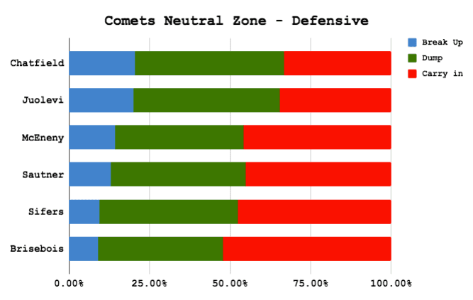 As you can see on the chart, Chatfield has been incredibly efficient moving the puck. Not only is he leading the Comets with a controlled exit rate of 52.73%, but he also has the lowest direct fail rate of 7.27%. This is an exceptionally low number, as he’s only iced or turned the puck over in the defensive zone eight times on 110 touches. To give that number some context, consider Erik Gudbranson had seven defensive zone fails in the first two periods alone last night versus Chicago on 16 touches. Furthermore, Chatfield has the teams second lowest team fail rate at 4.55%, which means he’s rarely putting his teammates in bad positions with the puck in when trying to exit the zone.