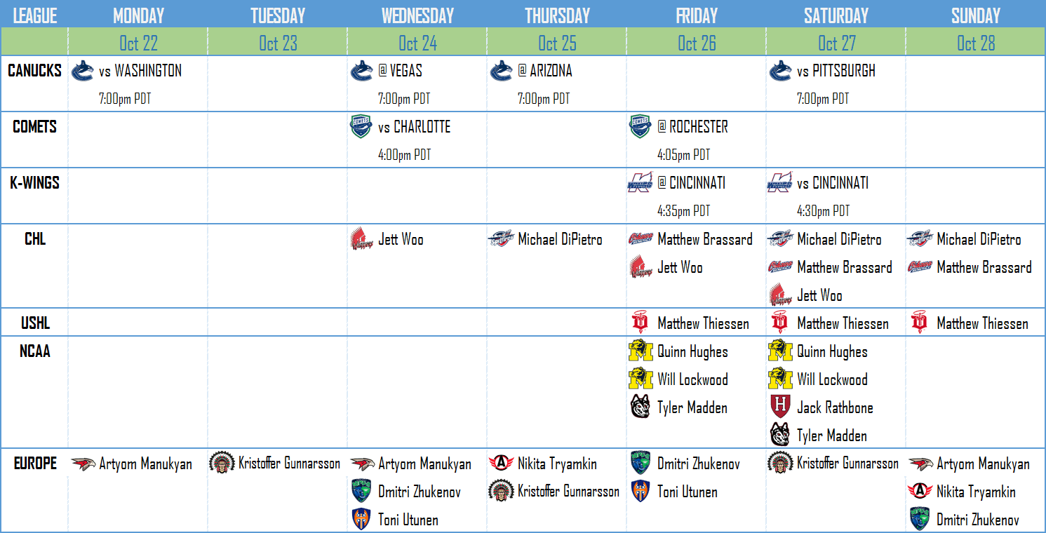 Let’s get straight into this week’s schedule for the Canucks, affiliates and various prospects.