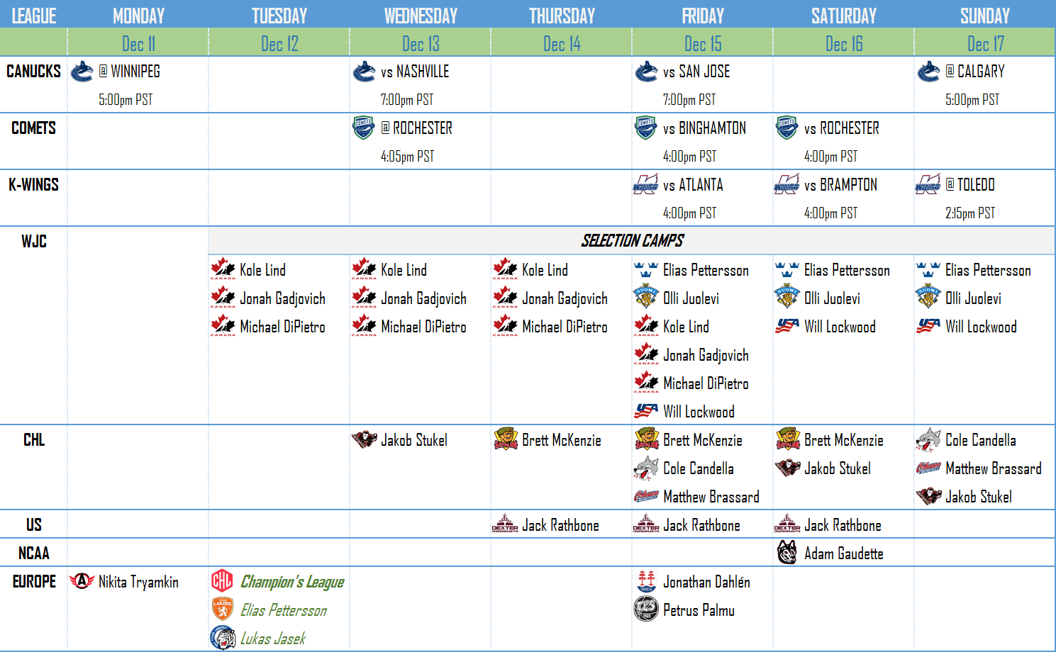 Hello Canucks fans, welcome to another Complete Canucks Schedule. I’m a couple of days late, but we haven’t really missed a whole lot yet. This is a big week for prospects, as the various national teams are beginning to get together for their selection camps in advance of the World Junior Championship that begins at the end of this month. Champions Hockey League is also in action again. Let’s get into the schedule, and then some notes, to find out more.