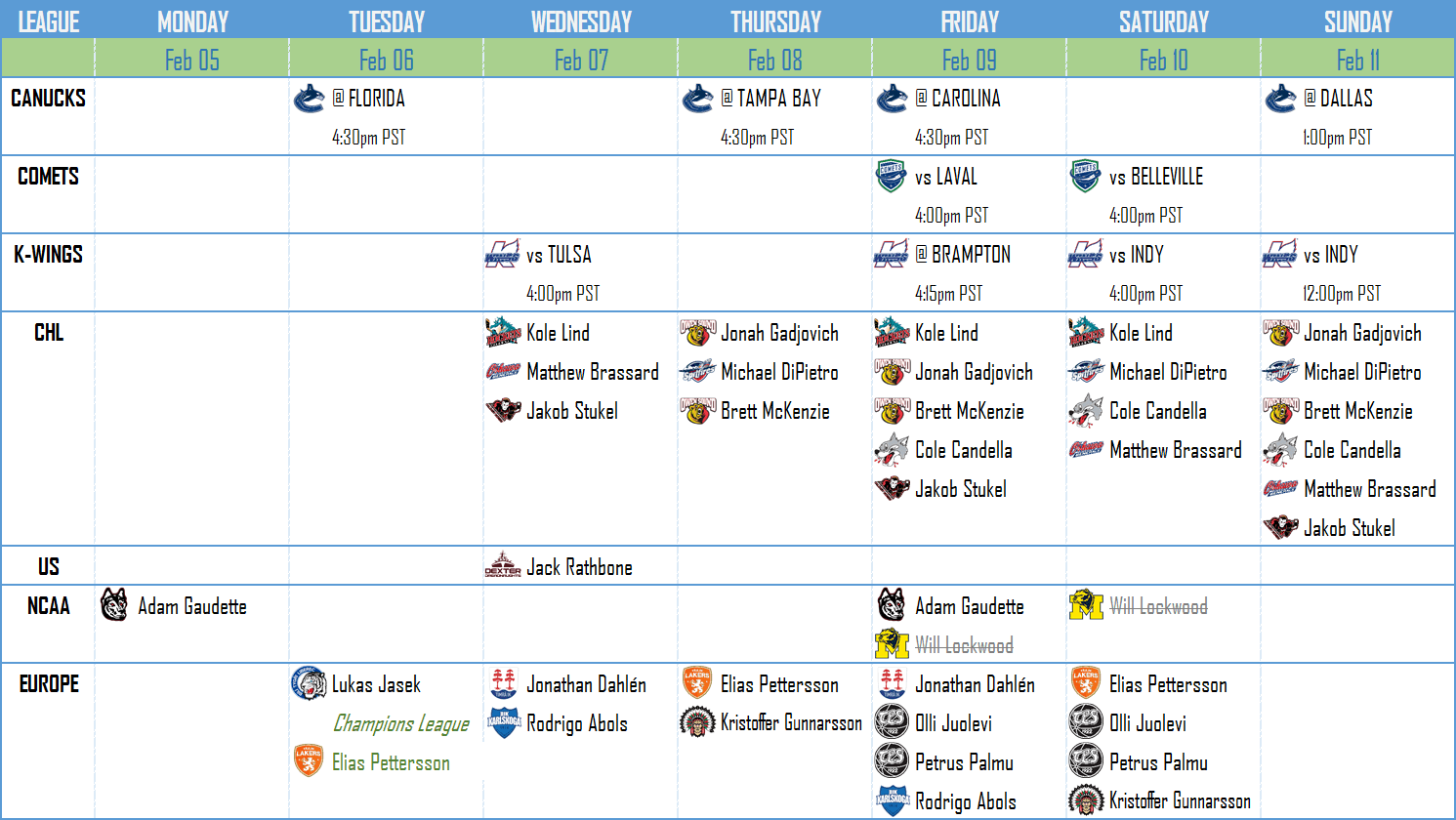 This week has some intrigue: it’s the annual Beanpot college tournament, and all Vancouver eyes should be on Adam Gaudette, the NCAA’s January Player of the Month. Check out the schedule first and then head to the notes, for times, channels, and further information.