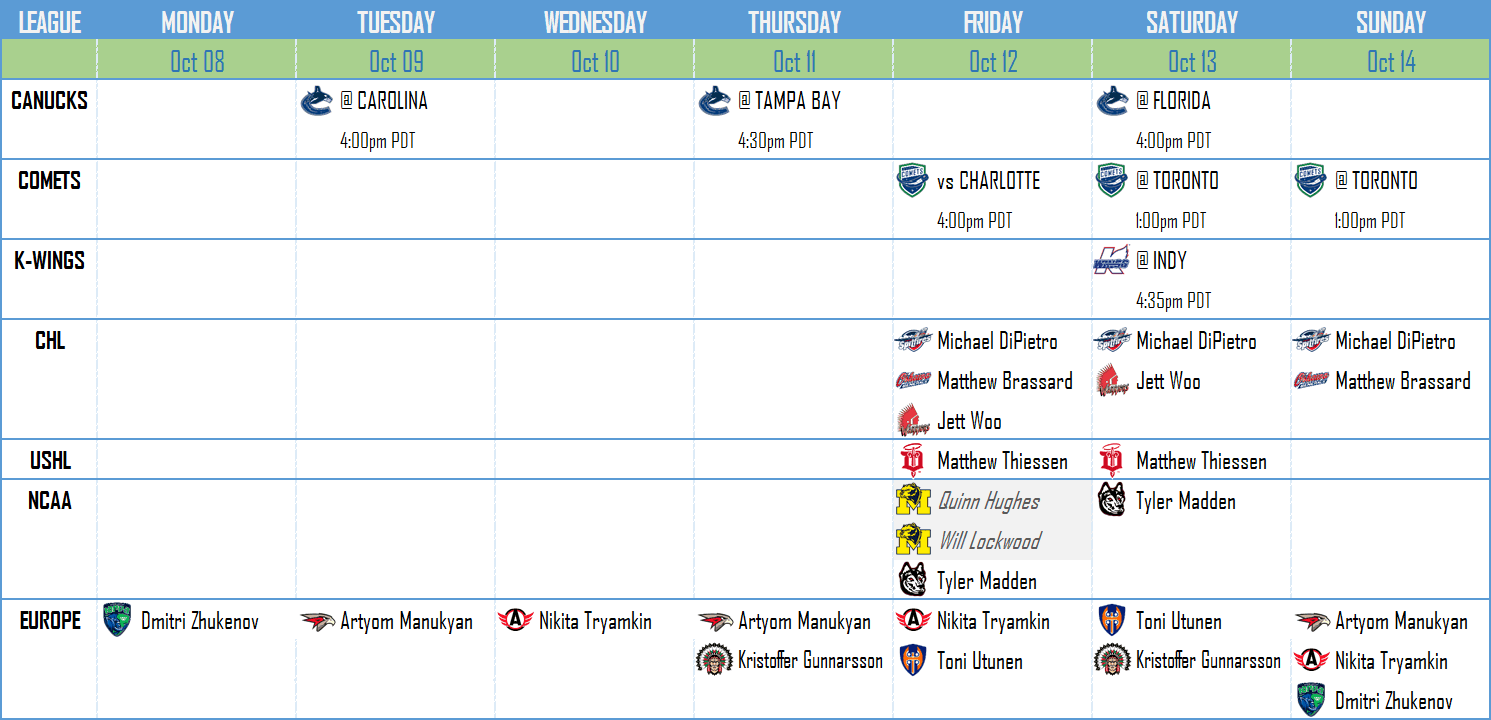 - Monday to Thursday is going to be excessively boring in most weeks, unless there is a Canucks game going on. The NCAA is predominantly a weekend league, and while the AHL and CHL dabble with weekday games here and there, they mostly get their business done between Friday and Sunday. Most European leagues function like the NHL, with games every two or three games throughout the week. However, the Canucks don’t have nearly as many players there this season, so there isn’t really much to watch out for. You can more or less tune out prospect stuff until the weekend at this rate.