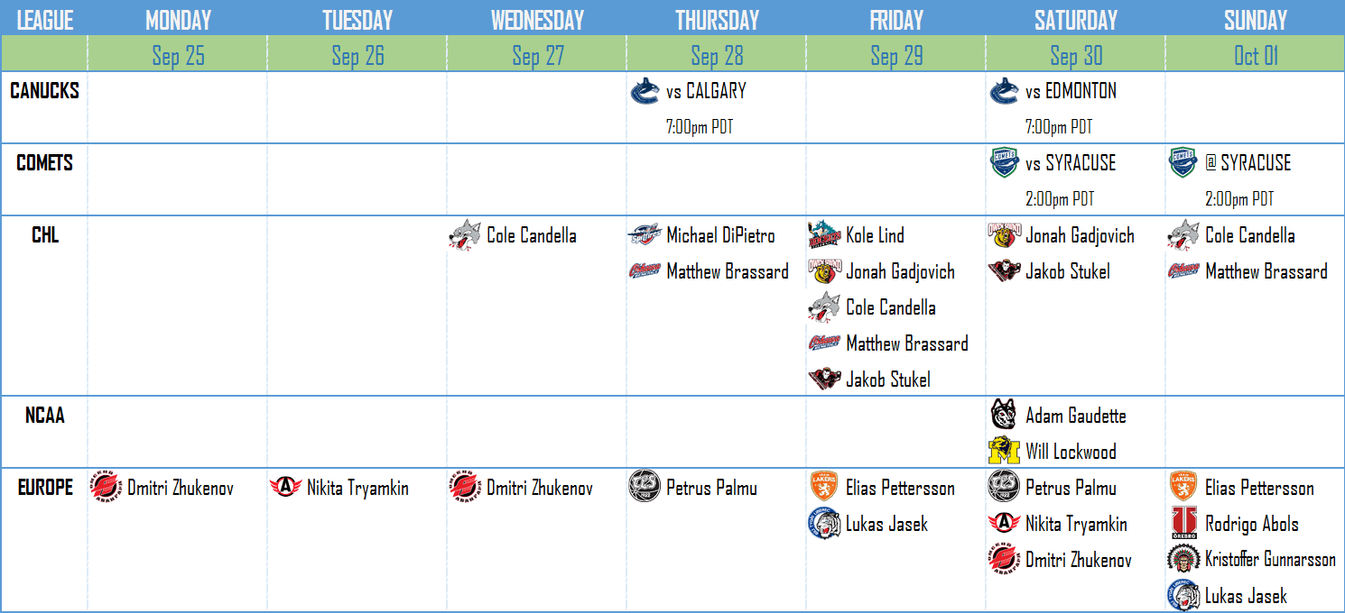 Welcome to a whole new season of Canucks hockey! While the jury is still on whether the Canucks will be any more entertaining this year than they were the last two, if the first week was any indication, their prospects will at least provide some more interest. Over the past week or two, all three CHL leagues got underway, joining the top European leagues in regular season action. This weekend, NCAA exhibition games will begin, and NHL exhibition games will end, which in turn means that AHL rosters will be populated. Things are definitely happening.