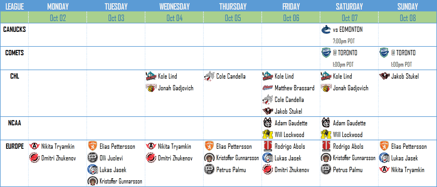 Welcome back to What’s on Tap, the complete Canucks schedule! This week is a big one, as the regular season kicks off for the Vancouver Canucks and the rest of the NHL. It’s also the beginning of the regular season for the American Hockey League, and the NCAA, meaning that there’s a whole other pile of Canucks prospects that we’ll be tracking on a weekly, or even daily basis.