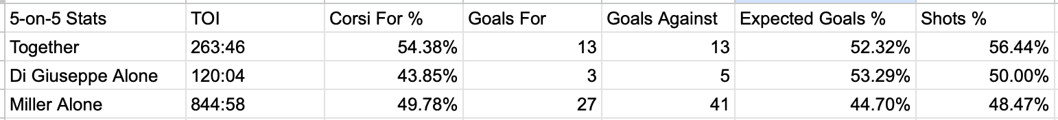 5-on-5 stats of Di Giuseppe and Miller together vs. alone. (NaturalStatTrick)