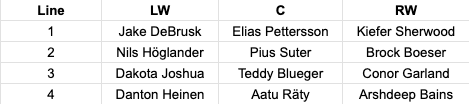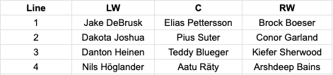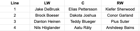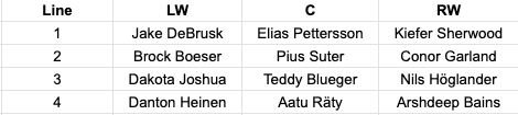 Now, this would be stacking your top line. Would it hurt your depth? Perhaps. But the production you should get from the top line, especially when Pettersson is going right now, would be the highest. This allows you to keep Joshua-Suter-Garland together.