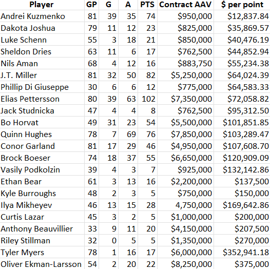 What’s a little amusing is that Phil Di Giuseppe’s 13 points cost nearly the same as Miller’s 82 per point. Obviously, PDG only played 30 games and was mostly utilized as an injury replacement in the middle 6, but he probably could’ve been even more efficient if given an extended run in the Canucks lineup.