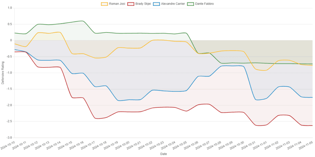 Fabbro has found himself as a healthy scratch in seven of the team’s first 13 games, losing his spot in the starting six to Marc Del Gaizo. Still, he’s reached higher affectiveness in his own end than some of his teammates as the chart above shows.