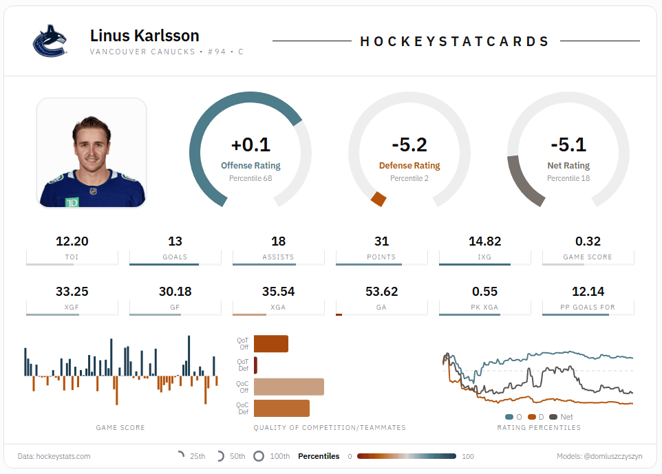 His work in the team’s middle six this season has been enough to earn a two-year contract extension in January. According to HockeyStatCards, which measures a player’s advanced stats value at both ends of the ice, Karlsson’s average GameScore of 0.32 is the fourth highest on the team, and the third-ranked forward behind Elias Pettersson and Jake DeBrusk.