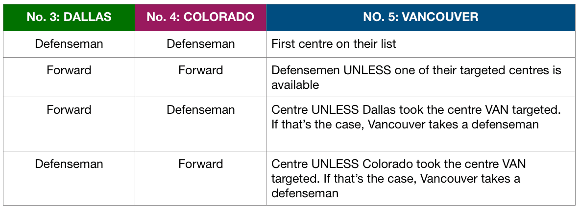 I’m almost certain when I say the Canucks’ first choice is a centre, and I’m merely basing this off Benning’s emphasis for a centre. Hopefully, this table breaks down my scrambled logic: