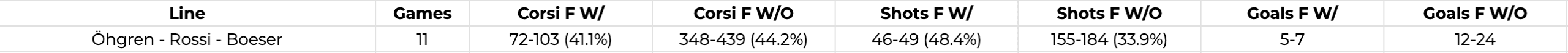 But then, Foote invented the BRÖ line. They got much longer of a runway, playing 11 games with each other, while drawing the hard matchups against the opposition’s top competition. However, they still managed to rack up respectable analytics given the circumstances compared to the rest of the team: