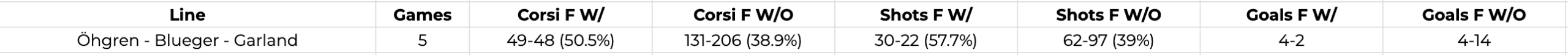 Then Öhgren began to earn Foote’s trust, and he was elevated to the third line with Teddy Blueger and Conor Garland in early February. Over the following five games in which the trio played together, they logged the most 5v5 ice time of any Canucks line, while still having the best analytics with them on the ice rather than in any other lines’ minutes: