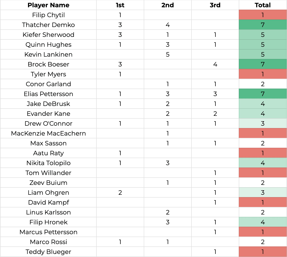 Again, there has been only one player who you could warrant giving the most valuable player of the year award to, and it’s Filip Hronek. Since the Hughes trade on December 12, Hronek leads not only all defencemen, but the entire team in points with 28. He leads Brock Boeser by one and Elias Pettersson by two.