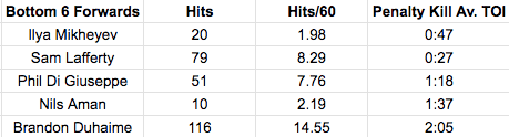 With the lowest point total of the bunch, Duhaime lacks a bit offensively. Comparing these numbers may be a bit skewed, as Duhaime has played the majority of his ice time with Vinni Lettierri and Connor Dewar — while forwards like Mikheyev, Lafferty, and Di Giuseppe have seen stints in the Canucks’ top six this season and in turn, have bumped up their offensive stats.
