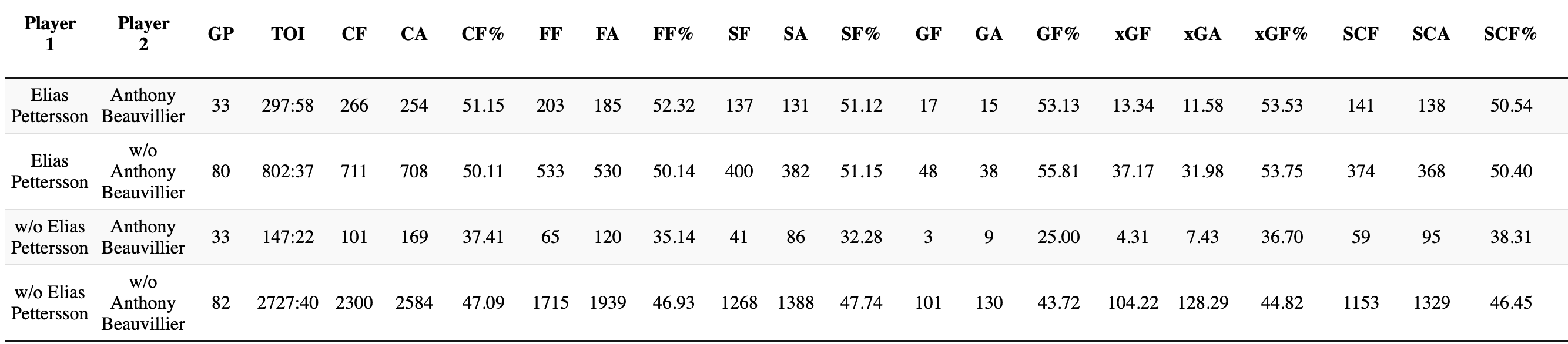 Elias Pettersson’s and Anthony Beauvillier’s 2022-23 stats with and without each other. (Natural Stat Trick)