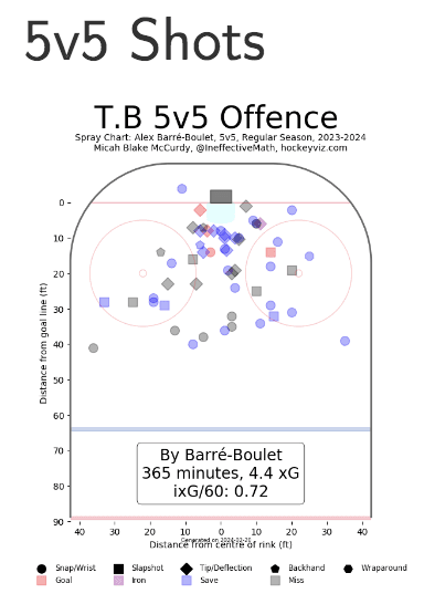 Where Barré-Boulet falls short is his lack of hits and penalty killing while being an extremely low rate-shooter with a low volume of rush attempts and rebounds created at 5-on-5. HockeyViz.com shows that most of his attempts on goal at 5-on-5 have come from the dirty areas around the net—