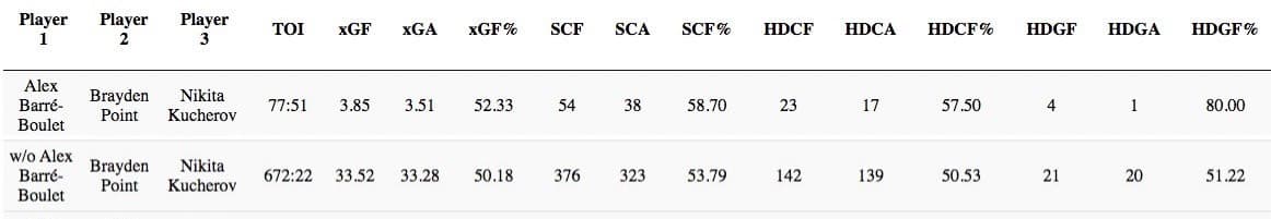 Though brief, the Lightning had a slightly better control of expected goals (xGF%), scoring chances (SCF%) and high-danger scoring chances (HDCF%) with Point and Kucherov playing with Barré-Boulet on their line than they did with that duo playing with Steven Stamkos, their most frequent linemate at even-strength this season.