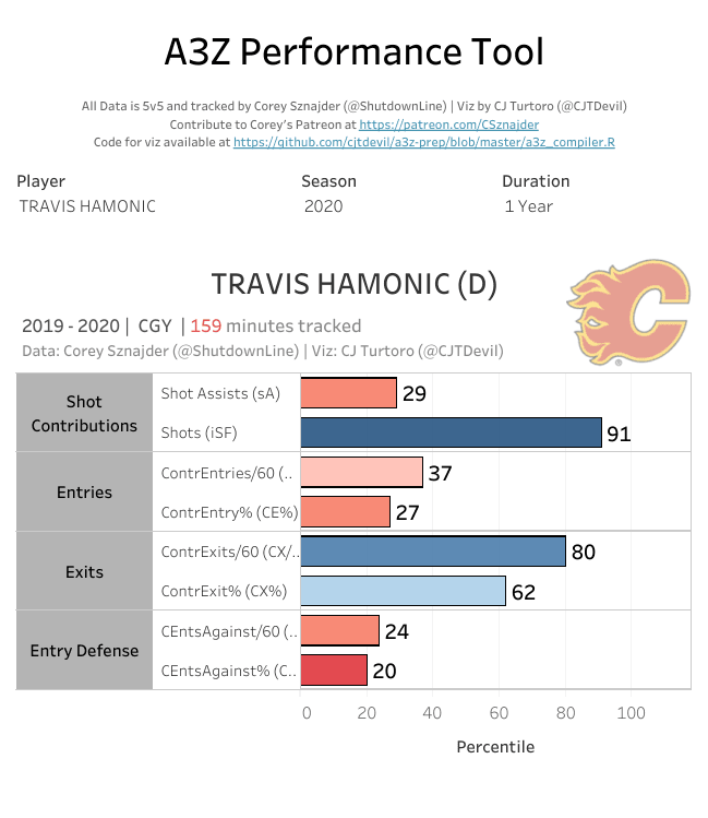 Flipping back to the A3Z, Hamonic proves surprisingly proficient in Controlled Zone Exits, ranking well above average and above Tanev. Neither player excels in Controlled Zone Entries, but again Hamonic has the edge.
