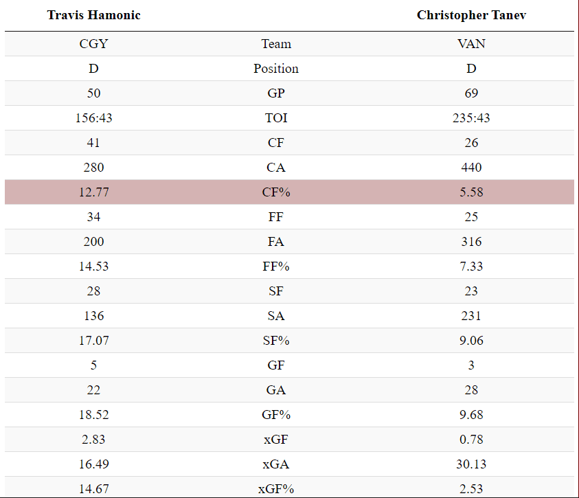 More specifically, Faber already covered the myriad statistical categories in which Hamonic has held a recent advantage over Tanev, which is most of them. Hamonic holds the 2019/20 lead in Expected Goals, Scoring Chances, High-Danger Chances, and a massive one in Corsi.
