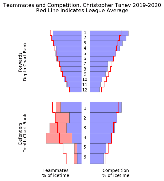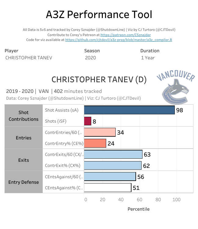 At even-strength specifically, Tanev enjoyed superior 2019/20 rates in Expected Goals For and Shots For.
