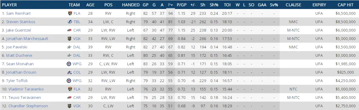 Only four of these 12 forwards could be categorized as “big fish”: Sam Reinhart, Steven Stamkos, Jake Guentzel, and Jonathan Marchessault.