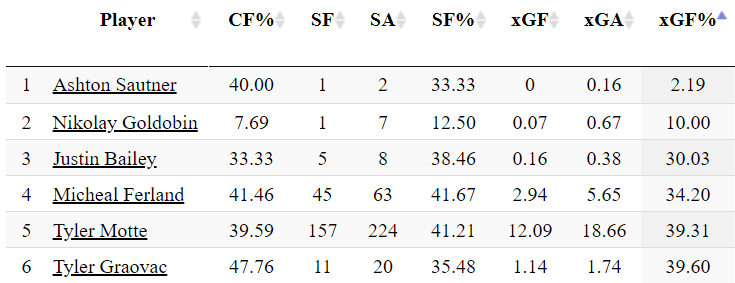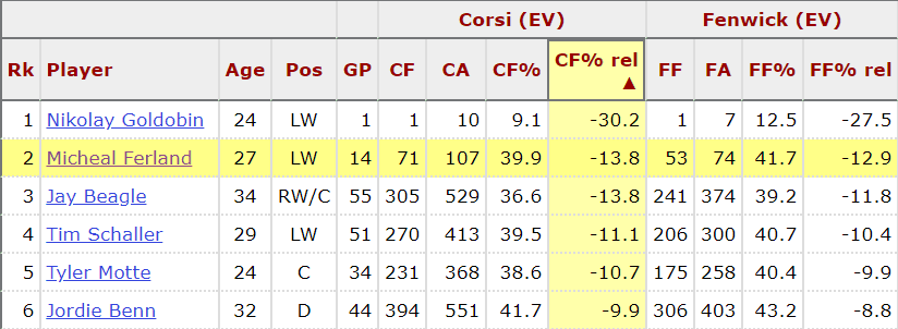 Speaking of sample sizes, it’s probably time to talk about Ferland’s overall advanced statline – which wasn’t exactly encouraging. Ferland sits at or near the bottom of almost every single notable category, including Corsi, Expected Goals For, and Scoring Chances.