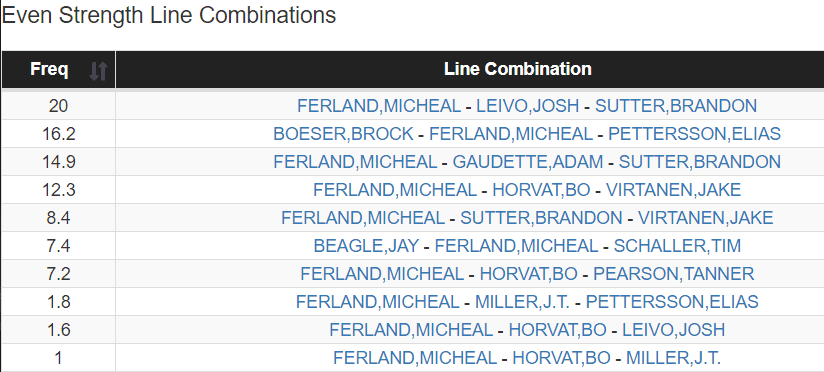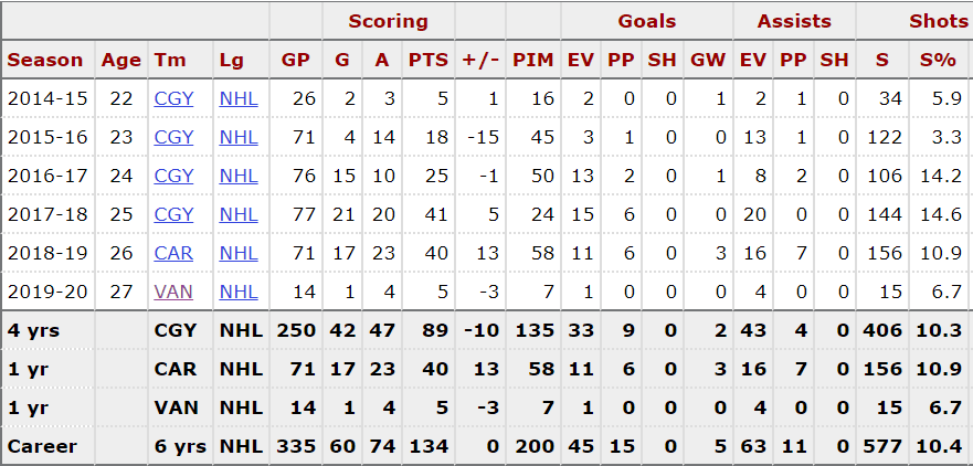 The real root of Ferland’s limited production, however, seems to be his limited deployment. Even during his first 11 healthy games of the season, coach Travis Green only played Ferland for an average of about 11 minutes per game – far less ice-time than Ferland received while scoring at a 20-goal pace for the Flames and Hurricanes in the two seasons prior.