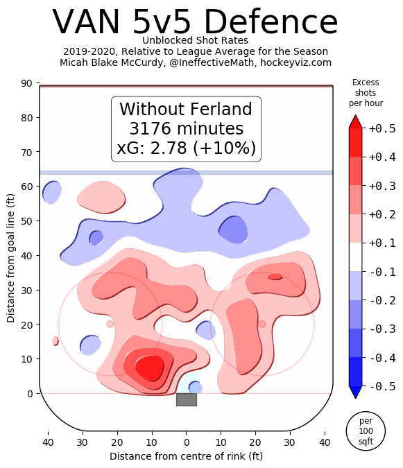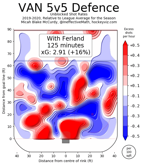 Defensive shortcomings might explain Ferland’s reduced minutes, but that does not seem to be the case based on what is, admittedly, a very small sample size put together by HockeyViz.