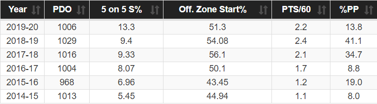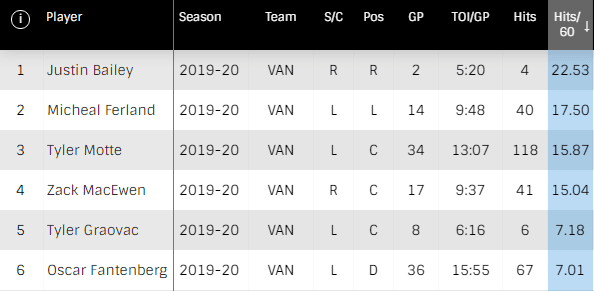 In fact, Ferland’s points-per-60-minutes rate of 2.2 is right in line with his rate of production in both 2017/18 and 2018/19, which might lead some to conclude that he would have scored at the same pace in Vancouver if he had received the same amount of ice-time. Ferland’s points-per-60-minutes also ranked tenth on the team overall.