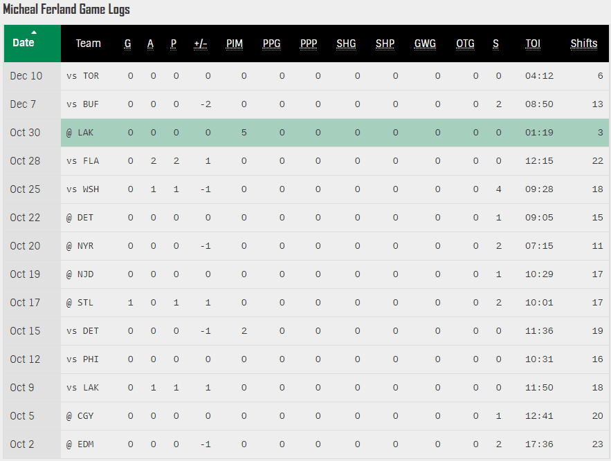 Instead, Ferland’s minutes only decreased throughout October, and he received fewer offensive zone starts and significantly less powerplay time than he had with his previous teams. He was also slotted all over the lineup, never landing on a consistent line for more than a game or two at a time.