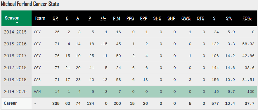At first blush, Micheal Ferland’s first season with the Canucks does not look like it was a successful one. With just one goal and five points across 14 games, Ferland was on pace for less than 30 points even if he did play a full season – which he did not. In fact, Ferland’s point-scoring pace was his lowest since his sophomore season with the Calgary Flames, and his goal-scoring pace was the worst of his career.