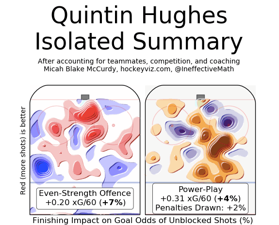 If you watched even one of his games this year, you don’t need me to tell you how special Hughes is, especially with the puck. He provided the Canucks’ power play a whole new threat with his abilities to walk the line and let go of a sneaky good shot in a hurry. As you can see, Hughes’ impact on the offensive side was significant at both 5-on-5 and with the man advantage: